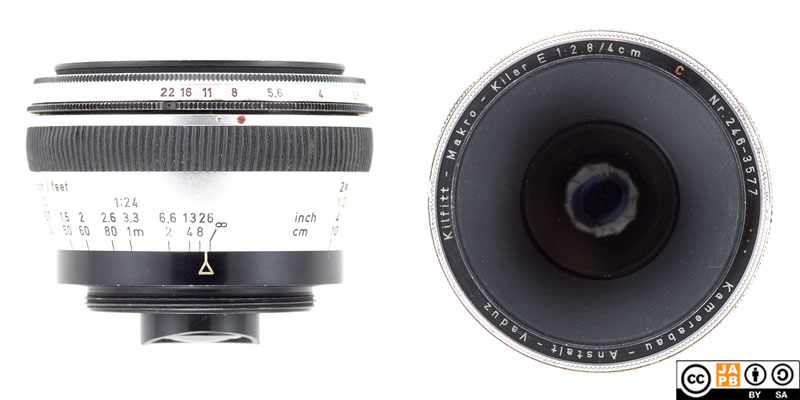 In the early 1950s Kilfitt stumbled upon an underserved niche and started manufacturing lenses that could be used as macro lenses without the use of a bellows. Previously life size (1:1) macro invariably necessitated either bellows, adjustable extension rings or close-up lenses (or a combination of these). Such approaches not only were far from hassle-free, they also typically necessitated a specialised rig and stable circumstances for photography. Kilfitt launched a series of ‘Macro-Kilar’ lenses that could be used both in normal landscape photography (i.e. they could be focused to infinity) as well as in semi-serious macro work (1:2 or 1:1 maximum magnification without any added extension rings or bellows).