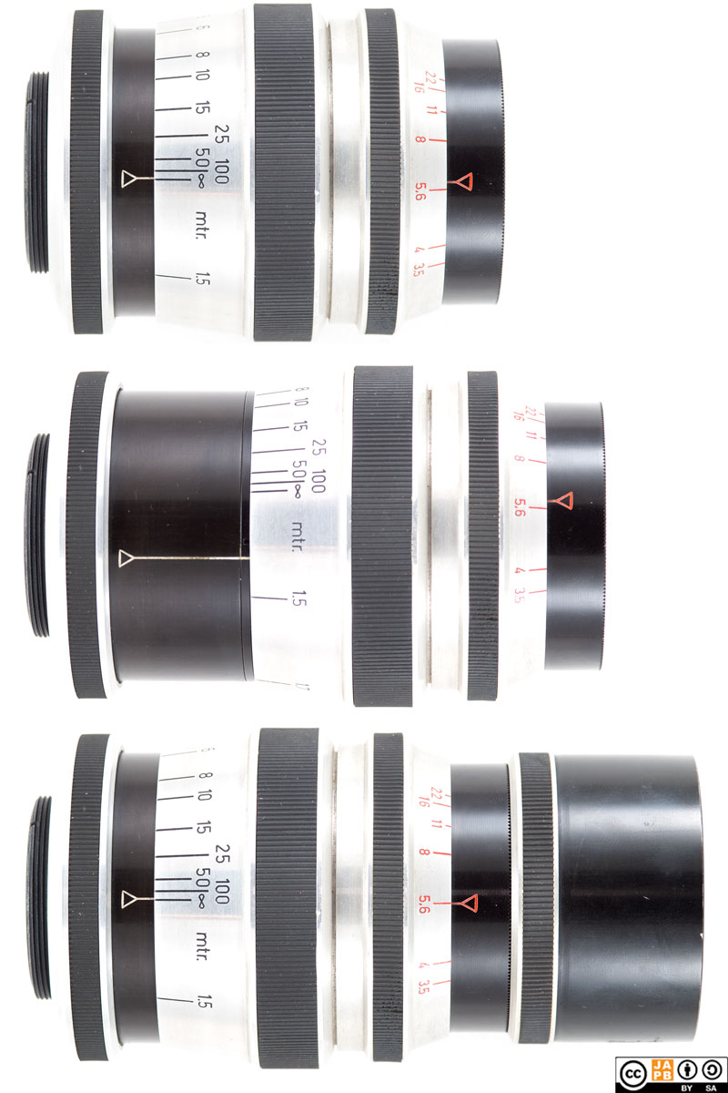 Bottom: Kilfitt Kilar 150 mm f/3.5 focused at infinity (with lens hood)