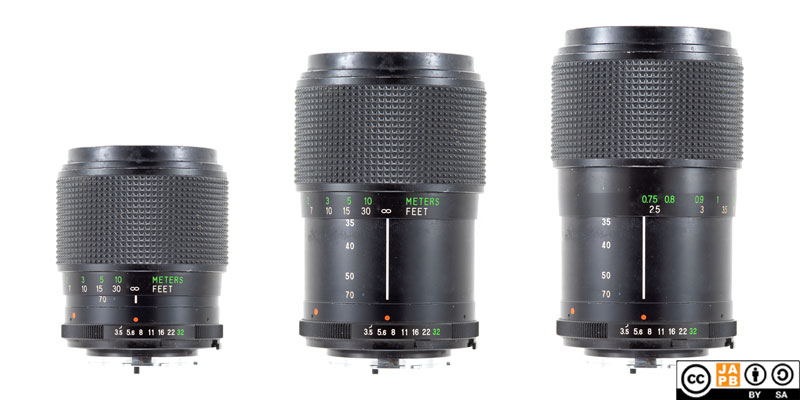 • The Vivitar 35–70/3.5 is a one-ring, push-pull zoom. Its zooming action is reversed, meaning that you push forward for a wider angle-of-view (which is rather typical for many similar lenses of this era).