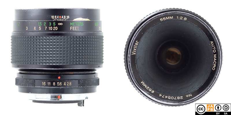 • There are other similar era lenses that feature the same specifications (55 mm f/2.8, 1:1 macro with two-sided helicoid) sold under the names of other obvious rebranders (e.g. Rokunar V-HQ 55mm f/2.8; Elicar V-HQ Macro 55 mm f/2.8) that might be related designs.