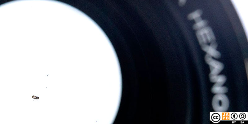 The picture below shows a lens which actually has the remnants of a bug embedded in the optics, and – moreover – relatively close to the optical axis/centre of the lens. Even so, I have never taken a picture with that lens which would have shown that bug.