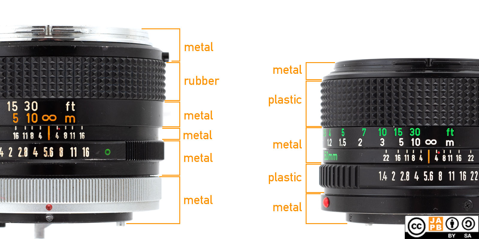 At the same time, plastics also moved in and started finding increasingly wider uses. This was especially true for cameras, but also on lenses where typically the first metal parts to be replaced by plastics would be aperture rings and name rings (aka. vanity rings), but most manufacturers stuck with metal alloys (instead of plastics) for external parts of lenses – until the advent of autofocus.
